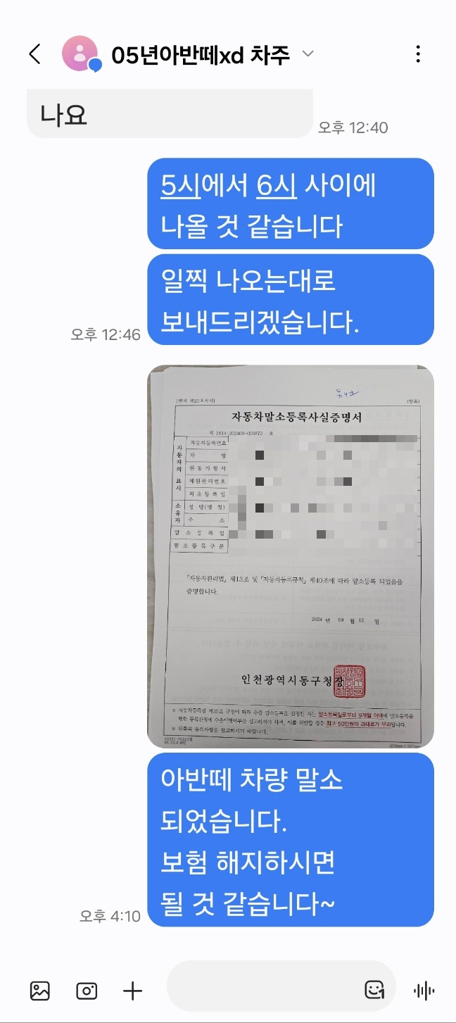 말소 후에는 말소 증명서를 차주분께 보내드립니다.